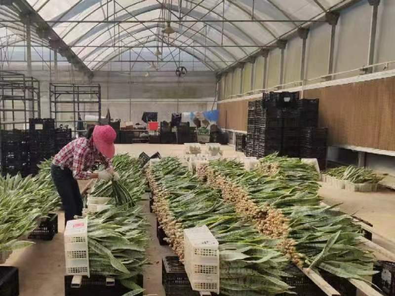 工人正在对收购来的虎皮兰进行清洗、消毒与分级